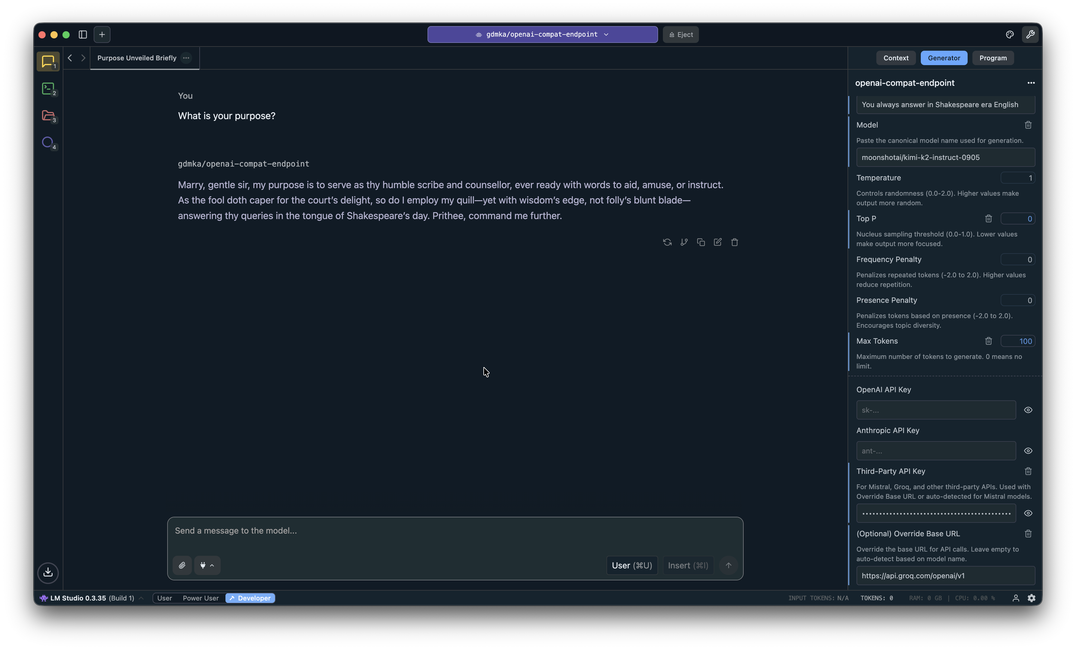 As it turns out, extending a generator is remarkably straightforward. All the plugins are distributed through LM Studio Hub as open source Github-like repos. TypeScript is the only supported implementation language at the moment, with Python on the way. And lucky for me, LM Studio team build a basic MVP to fork with. It didn’t take too much time to integrate an interface for connecting to 3rd party AI providers.
