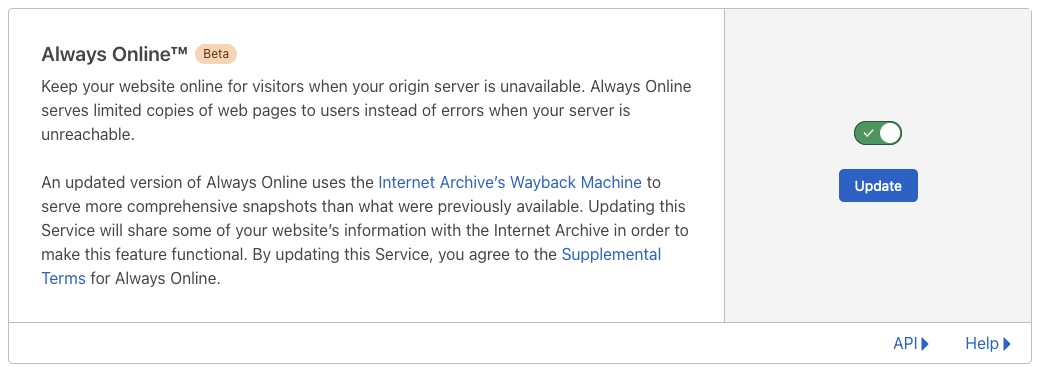 If checked with Github Incident History3 to count at least five incidents related to Github Pages in the last year, while Cloudflare Pages4 had three for the same period. Cloudflare offers at least two options to mitigate the possible availability issue. One of which is Always Online which takes snapshots for Wayback Machine. In case segments of Cloudflare responsible for Pages, experience technical issues, Always Online will save the day.