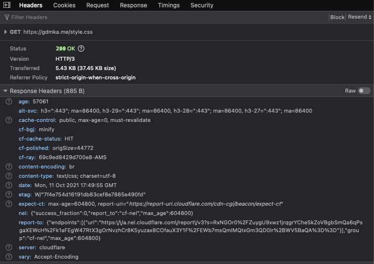 Combined with Brotli compression8, the final asset size was reduced by almost 89% when transferred over the wire. CF-Polished: origSize=44772 shows the original size of the CSS file in bytes (~ 45KB), CF-BGI: minify response header indicates that Cloudflare served a minified version and Content-Encoding: br that Brotli algorithm was applied. The end result is a compressed 5.43KB style.css with just two mouse clicks!
